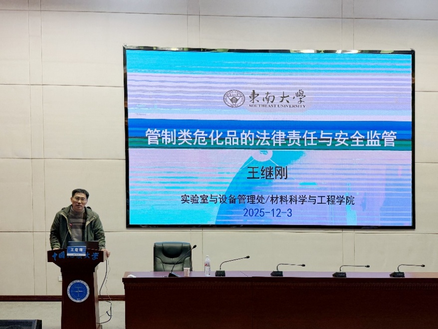 为强化实验室安全管理,提升管制类危化品管控能力,作为学校 2025 年实验室安全教育宣传月活动的重要组成部分,2025年12月3日,由学校实验室与设备管理处主办、偷拍外流 承办的管制类危化品安全专项培训顺利举行。东南大学实验室与设备管理处副处长王继刚、武汉纺织大学资产与实验室管理处副处长刘福金应邀指导,学校实验室与设备管理处副处长翁华强、偷拍外流 党委书记邓云涛出席,各单位实验室安全管理人员及涉危化品师生共 150余 人参训,培训会由偷拍外流 实验中心主任殷杰主持。